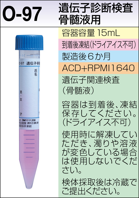 骨髄液は、ヘパリンを使用しないシリンジで規定量(0.5mL)を採取し、あらかじめ手元に用意した専用容器(O-97)に注入して速やかに転倒混和してください。専用容器に入れるまでに時間が経過したり、転倒混和が不十分だと、骨髄液が凝固してDNA又はRNA抽出ができなくなる場合があります。