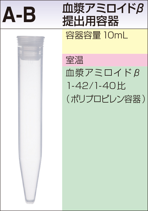 | 採取条件・提出条件 / 備考 | 血漿を弊社指定のポリプロピレン容器(A-B)へ移し替えて直ちに凍結してご提出ください。 アミロイドβ1-42、アミロイドβ1-40、Aβ42/40比を報告します。 溶血検体は避けてください。 |