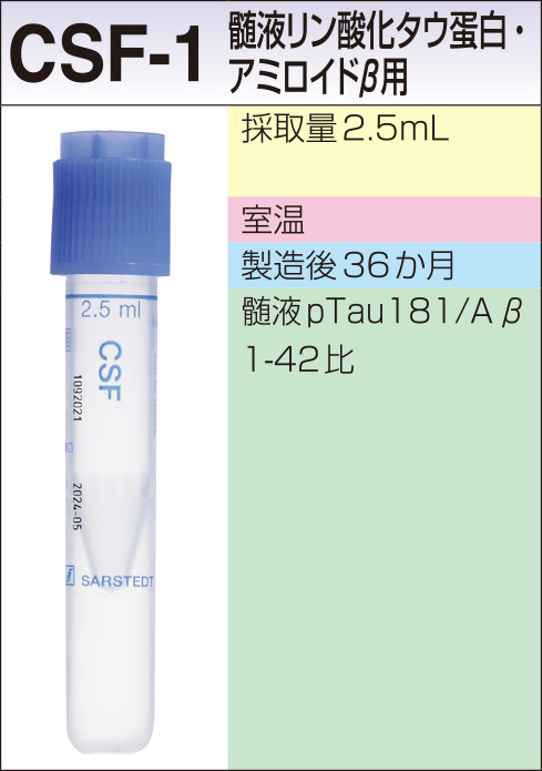 | 採取条件・提出条件 / 備考 | pTau181、Aβ1-42、pTau181/Aβ1-42比を報告します。 血液またはビリルビンの混入はデータに影響を与える場合がありますので、可能な限り避けてください。 ●補足情報参照 |