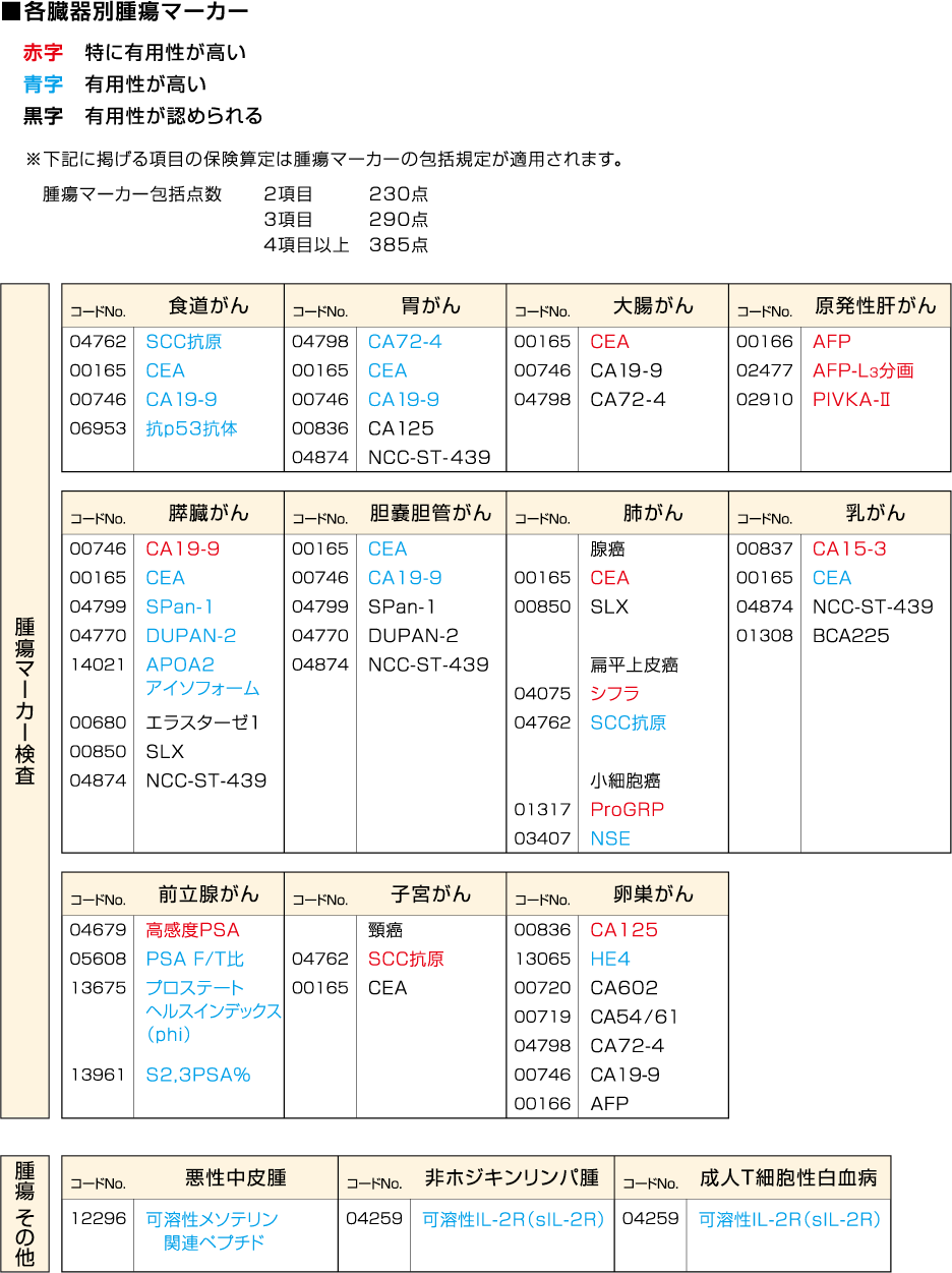 腫瘍マーカーは、悪性腫瘍の患者であることが強く疑われる者に対して検査を行った場合に、悪性腫瘍の診断の確定又は転帰の決定までの間に1回を限度として算定する。