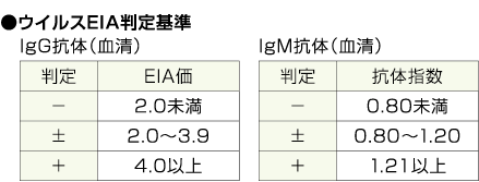 | 採取条件・提出条件 / 備考 | 判定結果とともにインデックス値、(IgG抗体ではEIA価、IgM抗体では抗体指数)を併記しますが、これはウイルス抗原に対する抗体の反応の強さを表します。 |