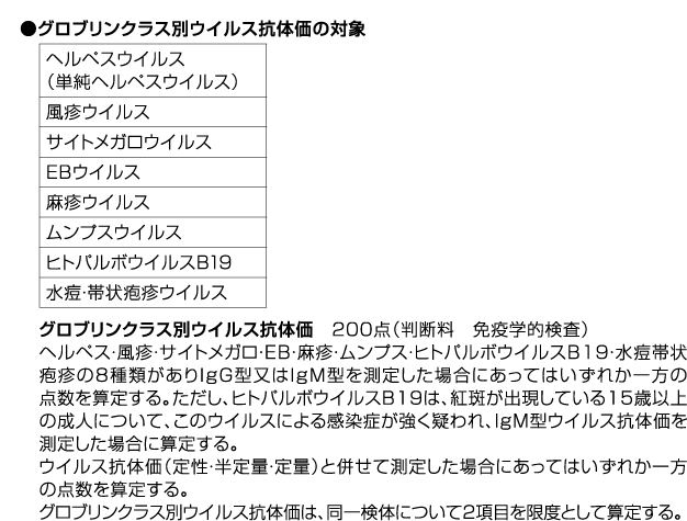 ※血清中ウイルス抗体価(定性・半定量・定量) 79 点(判断料 免疫学的検査)同一検体について8項目を限度として算定する。(対象となるウイルスの種類については補足情報の欄外をご参照ください。)又、同一検体について同一ウイルスに対する複数の測定方法を行った場合であっても所定点数のみを算定する。
