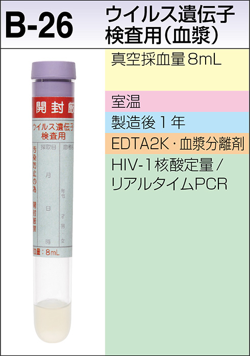 | 採取条件・提出条件 / 備考 | 汚染の影響を受けやすい検査法のため、核酸増幅法以外の検査項目との重複依頼は避けてください。 採血後、全血を2~25℃で24時間以内に遠心して血漿を分離してください。 血漿検体の遠心分離にあたっては、1200±400gで20分間の遠心分離を実施してください。 |
