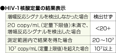| 解説 | HIV-1のウイルス核酸定量で新たにTaqMan プローブを用いたリアルタイムPCR 法です。 リアルタイムPCR法では、従来のエンドポイントPCR法による定量での測定範囲(ダイナミックレンジ)の狭さを解消できることに加え、高感度化を実現している。リアルタイムPCR法は40copy/mlから10の7乗copy/ml の広範囲でウイルス量を測定できる。 HIV感染のスクリーニングにおいては確認検査として、抗ウイルス剤による治療時にはウイルス量のモニタリングに適する。 |