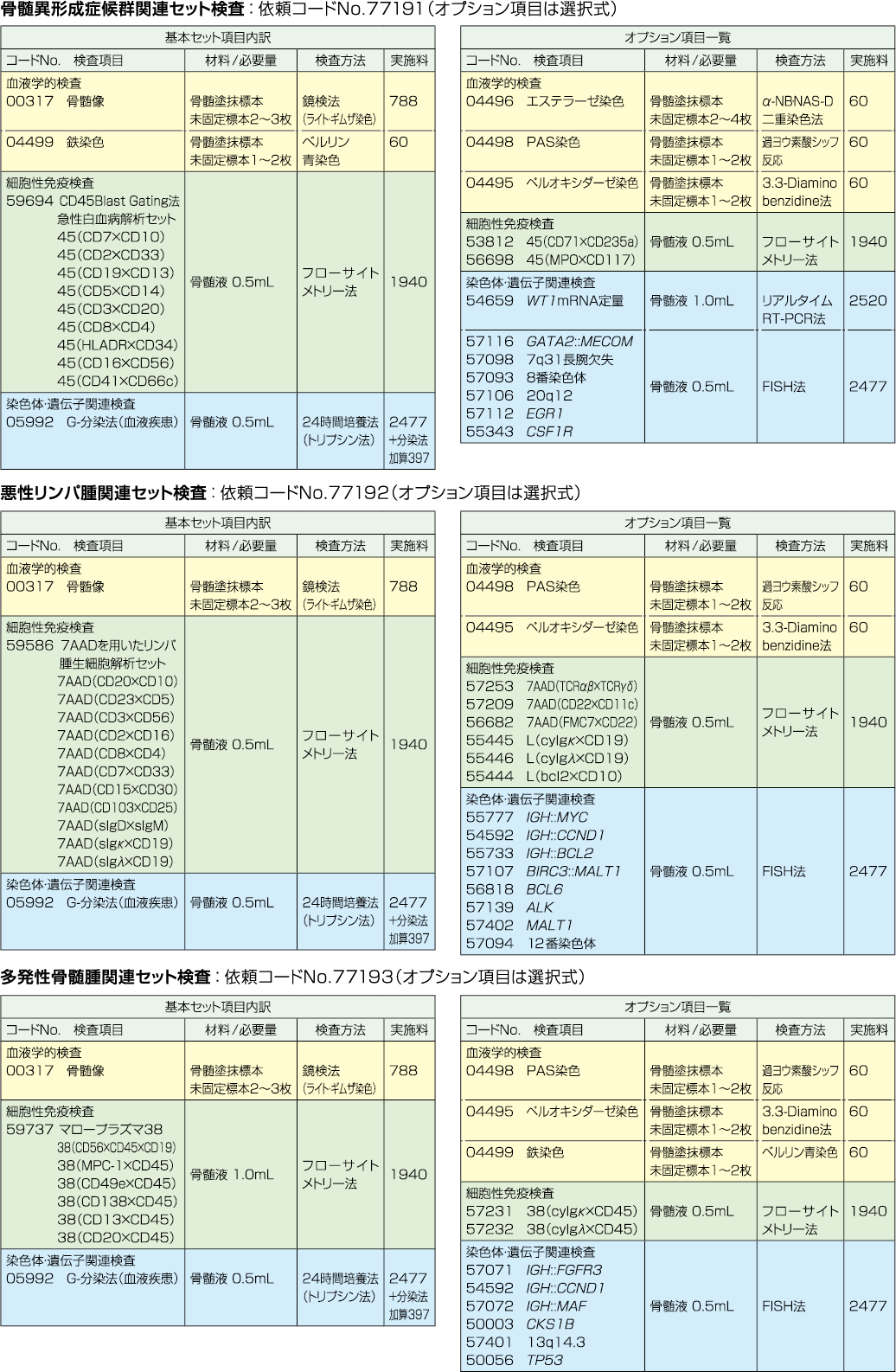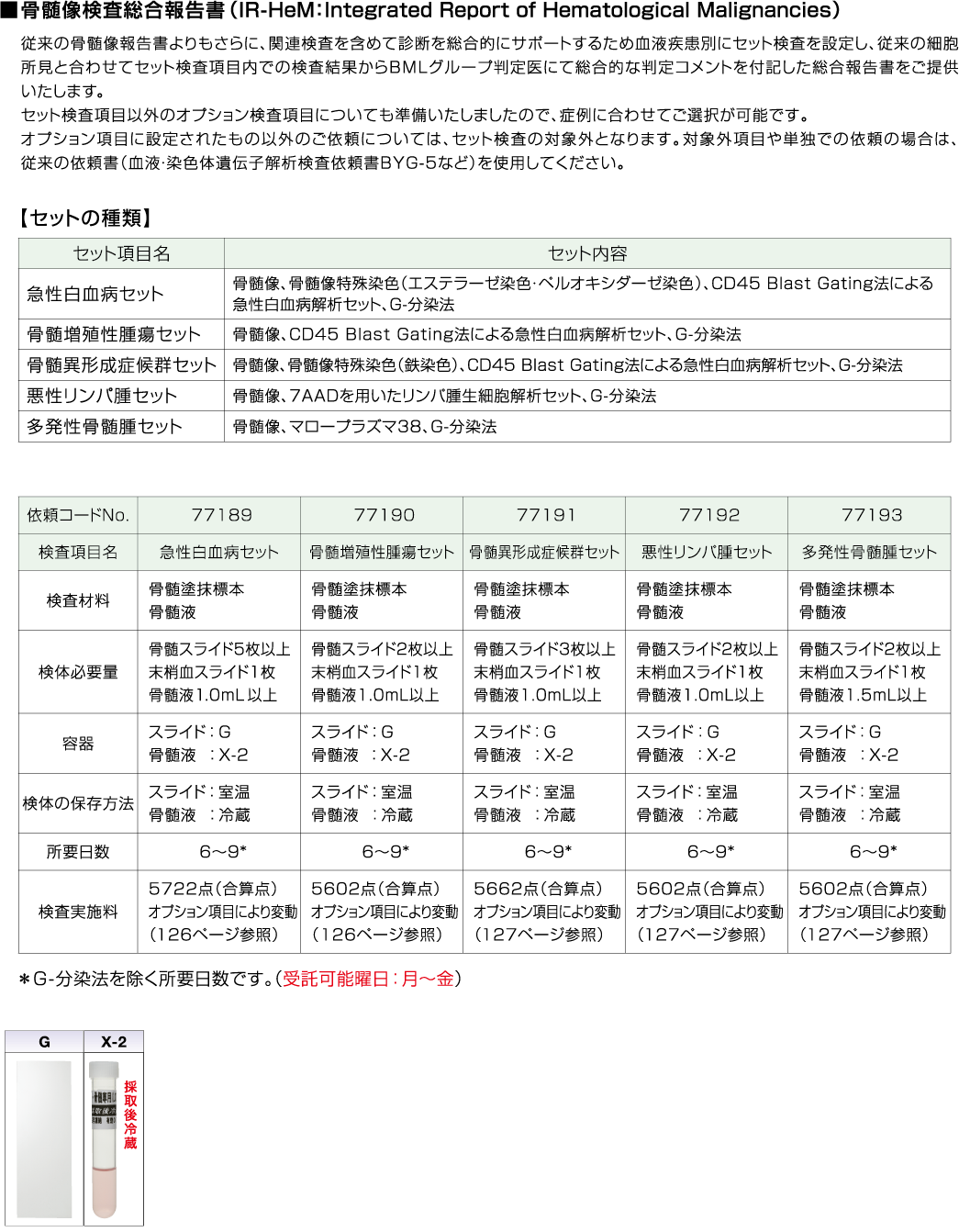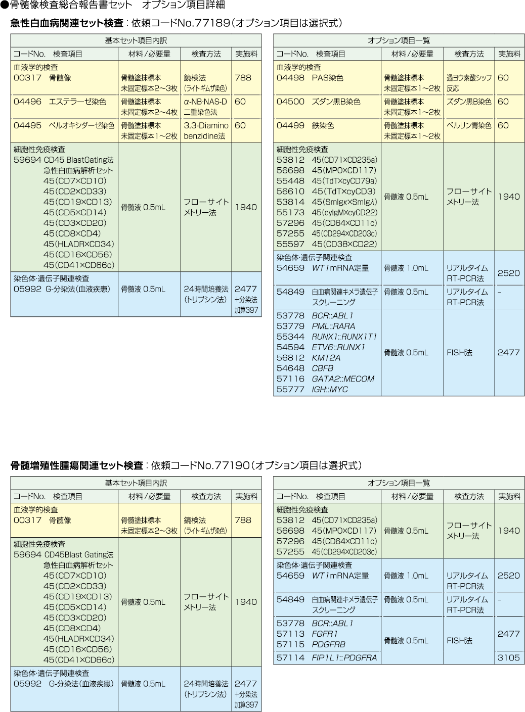 | 採取条件・提出条件 / 備考 | セルブロック用検体の同時提出を推奨いたします。 骨髄像特殊染色については各項目の情報をご参照ください。 ◆ |
