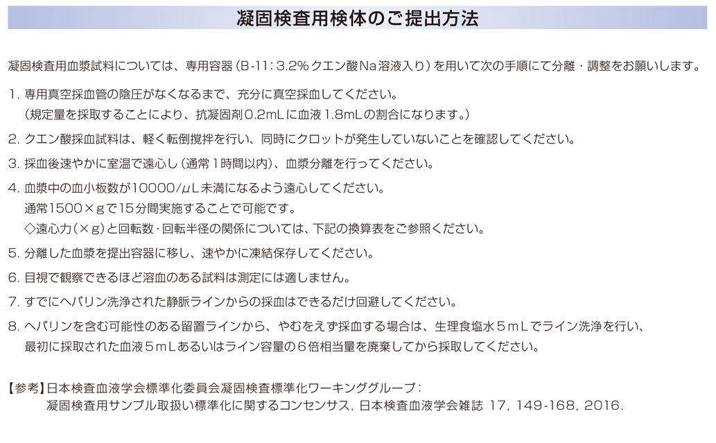| 採取条件・提出条件 / 備考 | プロトロンビン時間は試薬の力価により若干の変動があります。 ◆ |