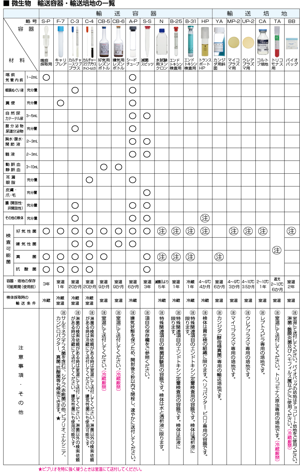 | 採取条件・提出条件 / 備考 | 材料が、便、皮膚、爪等は鏡検は実施しません。 酸素感受性蛍光センサー法は材料が便の時、検査は実施しません。 血液材料の場合はヘパリン入り採血管(B-18)にてご提出ください。 カルチャーボトルでの受付は不可。 スクリーニングは感度の高い蛍光法をご利用ください。 培地検体での提出はコロニーの発育が認められるものに限ります。 〔緊急報告〕 1.鏡検(蛍光法・チールネルゼン法)陽性の時 2.培養で陽性の時 |
