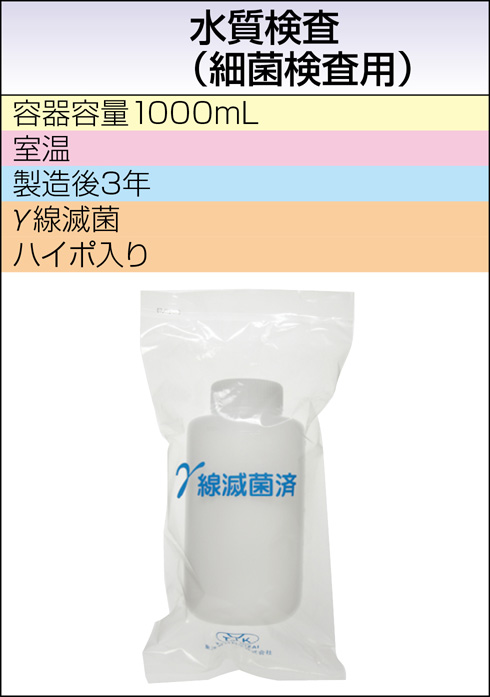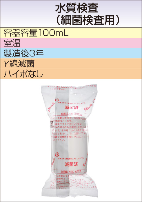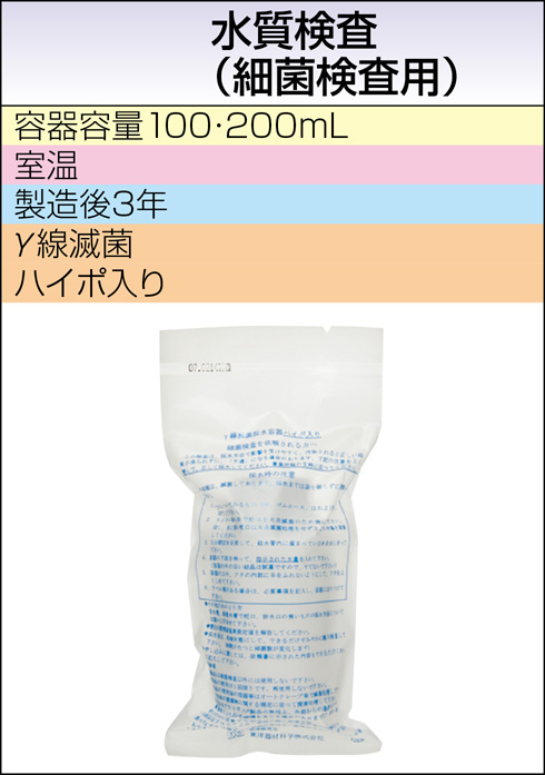 | 採取条件・提出条件 / 備考 | 〔材料〕プール水、浴槽水、クーリングタワー水 ※塩素殺菌剤が混入している水においては、ハイポ入り(塩素中和剤)滅菌済採水瓶をご使用ください。 |
