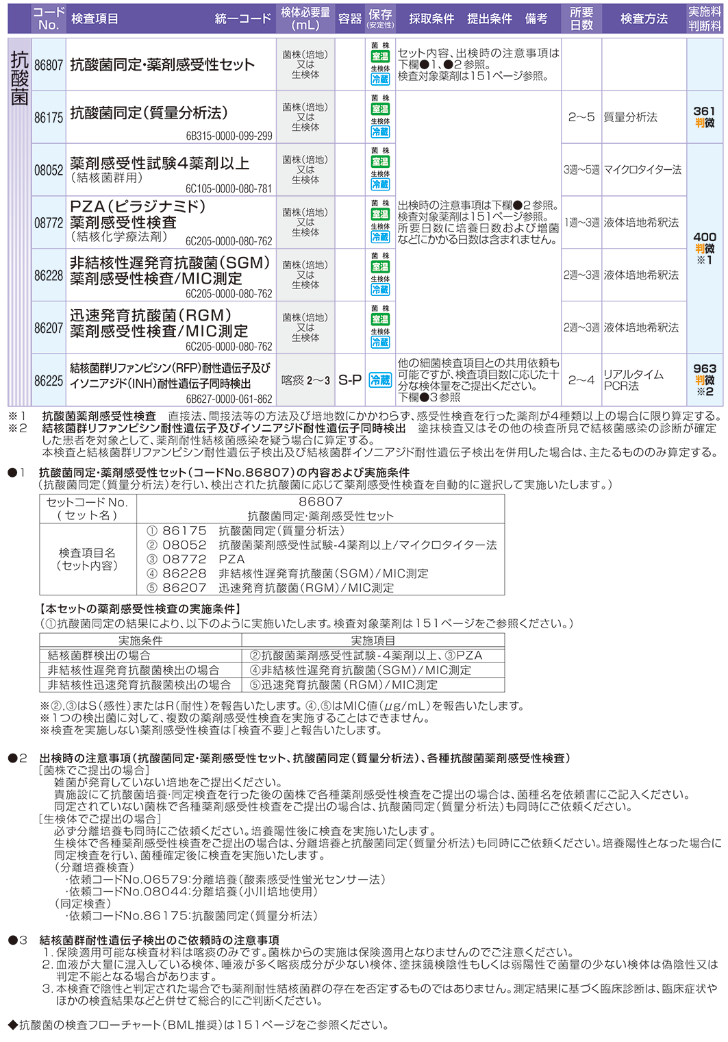 | 採取条件・提出条件 / 備考 | 菌種名,薬剤名を予めご連絡ください。1菌種,1薬剤,1依頼(該当項目コードのみ)となります。単一菌株にてご提出ください。MIC値でのご報告となります。判定結果(S.I.R)については報告いたしませんのでご了承ください。 保険収載されている非結核性抗酸菌の薬剤感受性検査は補足情報をご参照ください。 |