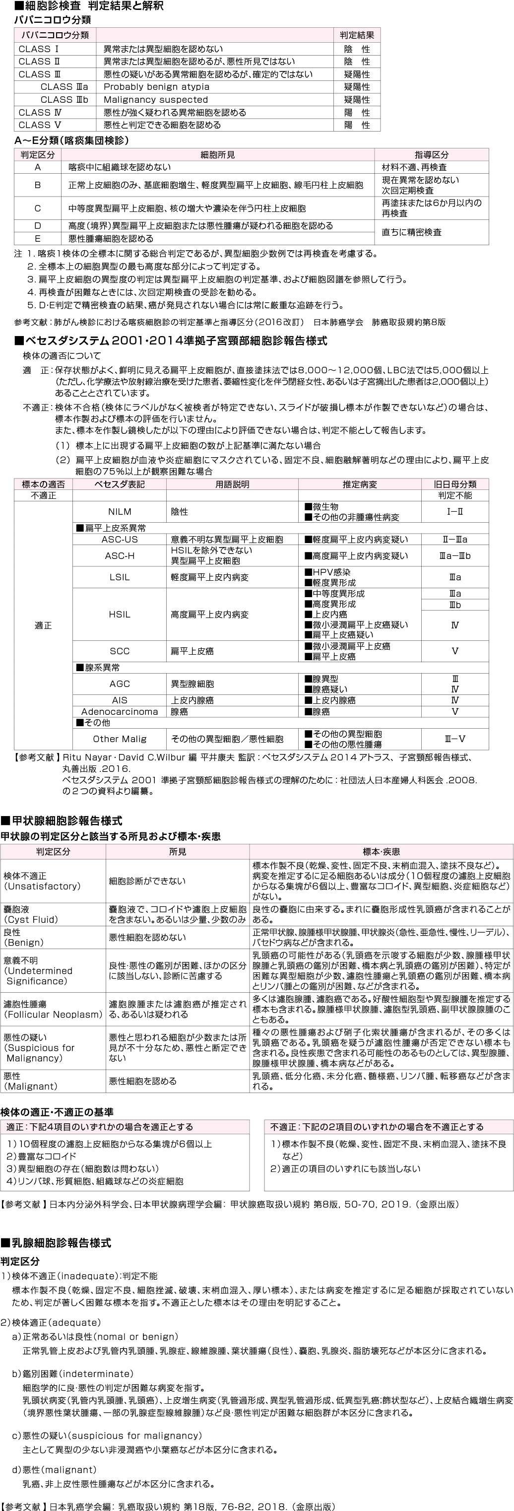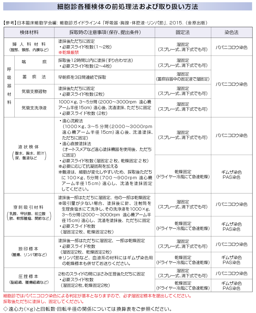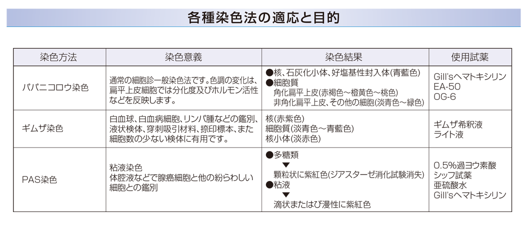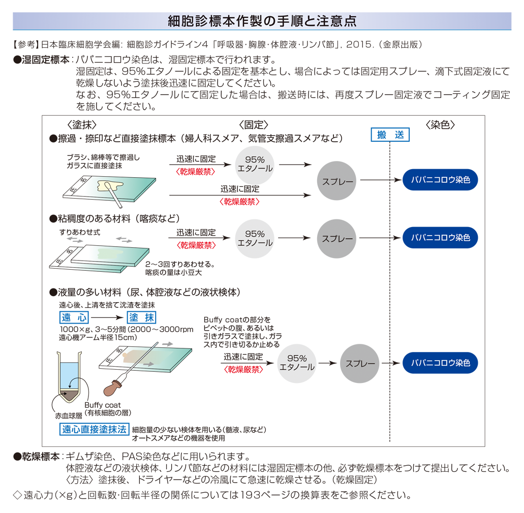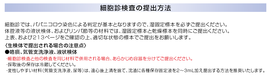| 採取条件・提出条件 / 備考 | 細胞診ではパパニコロウ染色による判定が基本となりますので必ず湿固定標本を提出してください。細菌検査とは別に提出してください。検体の提出方法、及び標本の作製方法については、補足情報をご参照ください。◆1補足情報参照 *中皮腫を疑う場合は依頼コードNo.11631中皮腫判定検査をお奨めします。 |