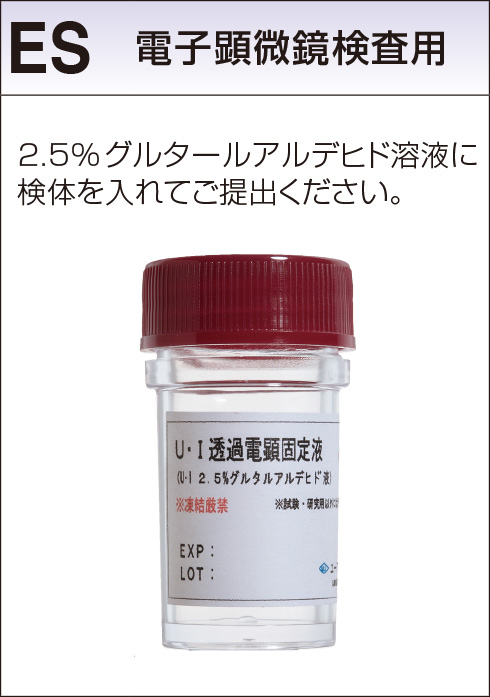 ●ES容器: 電顕検査用固定液(グルタールアルデヒド)は固定不良を防ぐため、製造日や有効期限、保存条件をご確認の上、新鮮な固定液をご使用ください。また、組織の固定が完了するまで(1~2mmの組織で2時間程度)固定液は冷蔵保存をしてください。