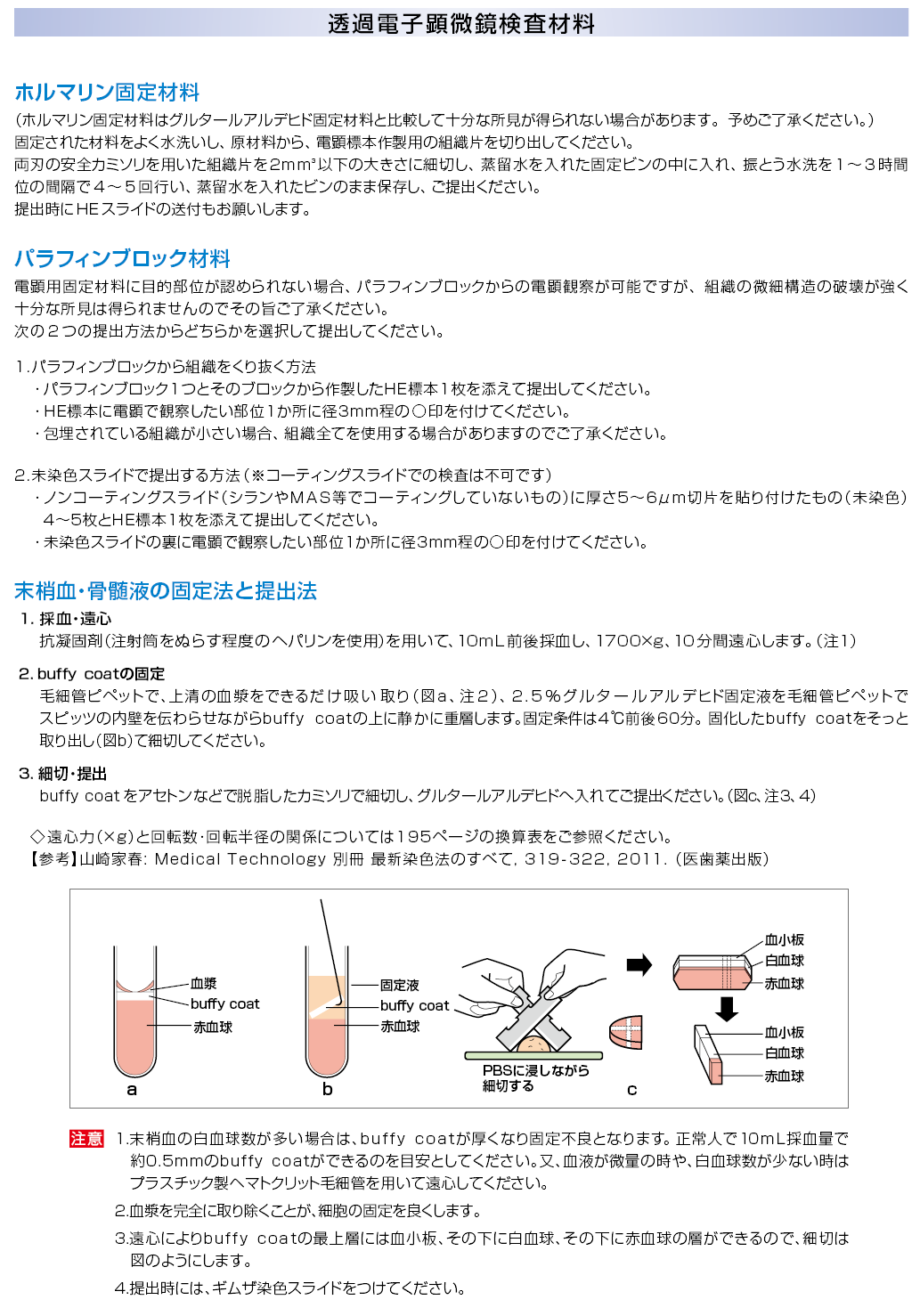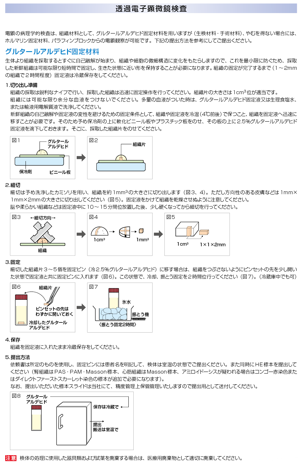 | 採取条件・提出条件 / 備考 | 検体の採取方法については補足情報をご参照ください。 写真報告書の返却は白黒となります。検査用に提出された光顕スライド、電顕ブロック、メッシュは精度管理上当社にて保管管理をしています。貸し出し及び返却はいたしません。予めご了承ください。ホルマリン固定材料はグルタールアルデヒド固定材料と比較して十分な所見が得られない場合があります。予めご了承ください。写真撮影のみのご依頼でも検査項目コードNo.は同一です。 解剖例は写真撮影までの実施となります。 腎生検と心筋生検の検査依頼の時は、臨床所見用紙を記入の上、添付してください。 |