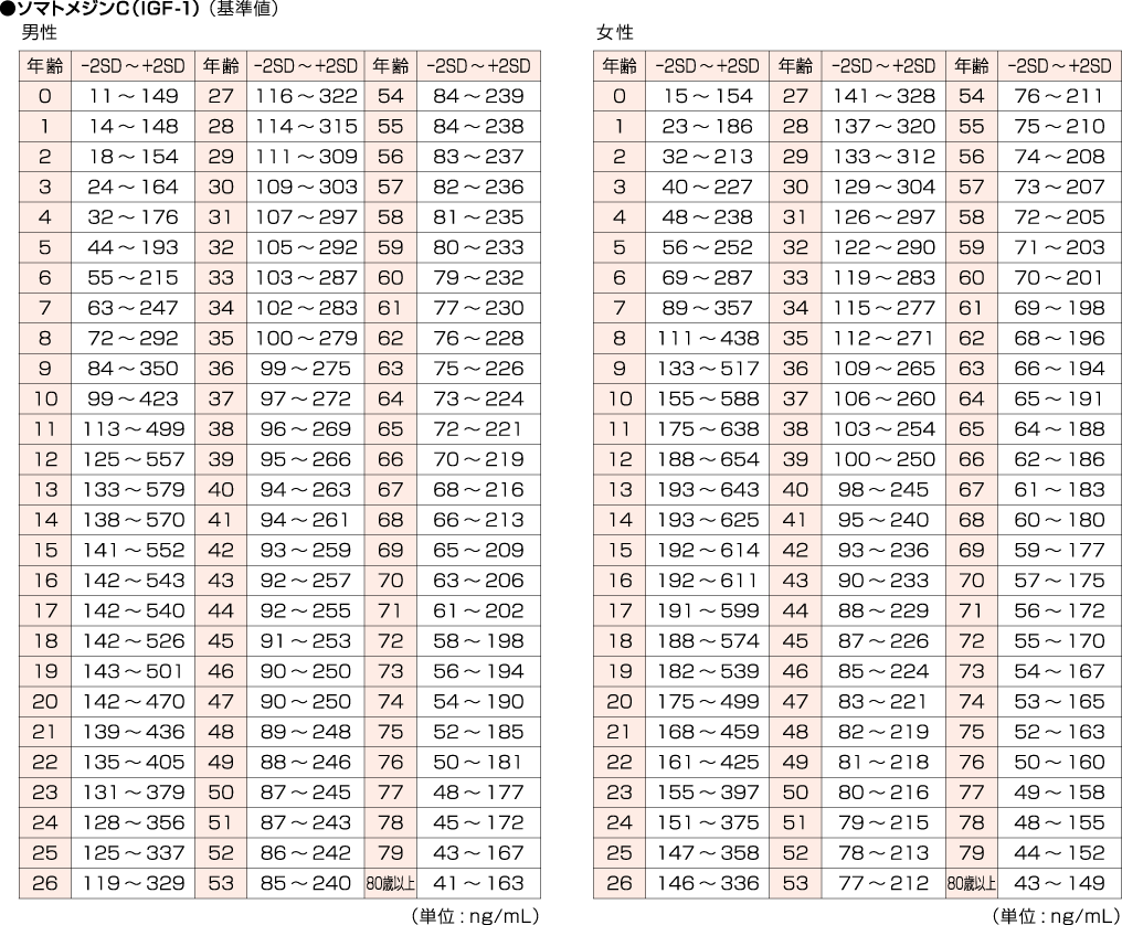 | 低値 | ■成長ホルモン分泌不全性低身長症(下垂体性小人症) ■下垂体前葉機能低下症 ■成長ホルモン単独欠損症 ■ラロン型低身長症 ■神経性食思不振症 |