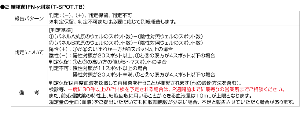 | 検査項目名称 | 結核菌IFN-γ測定 (T-SPOT.TB)(判定結果およびスポット数) |